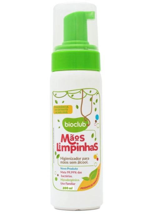 Espuma higienizadora para mãos sem álcool e com extrato de melissa. Elimina 99,9% de bactérias e germes. Proteja a sua família com o Mãos Limpinhas.